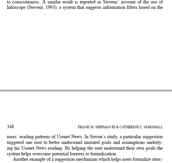 Infoscope is a news reader system that suggests filters based on users’ reading patterns; this helps them make their goals explicit which can facilitate formalization after it emerges from their task behaviors (p. 347-348)